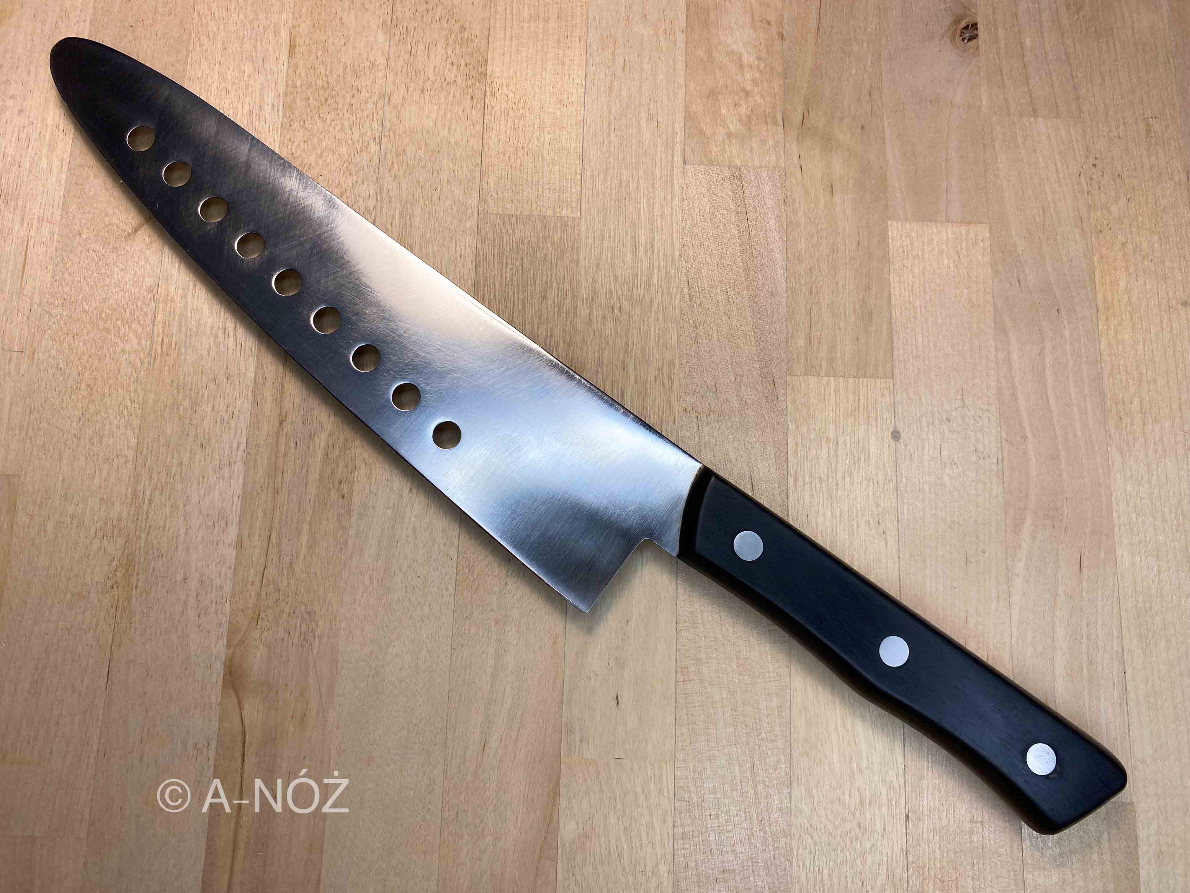 - Otwory i subtelne przetłoczenia na ostrzu redukują przywieranie składników i zmniejszają wagę noża, zapewniając płynne, szybkie oraz wyjątkowo precyzyjne cięcie na poziomie profesjonalnym.